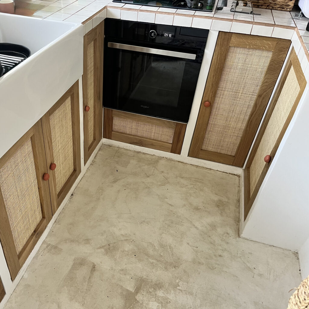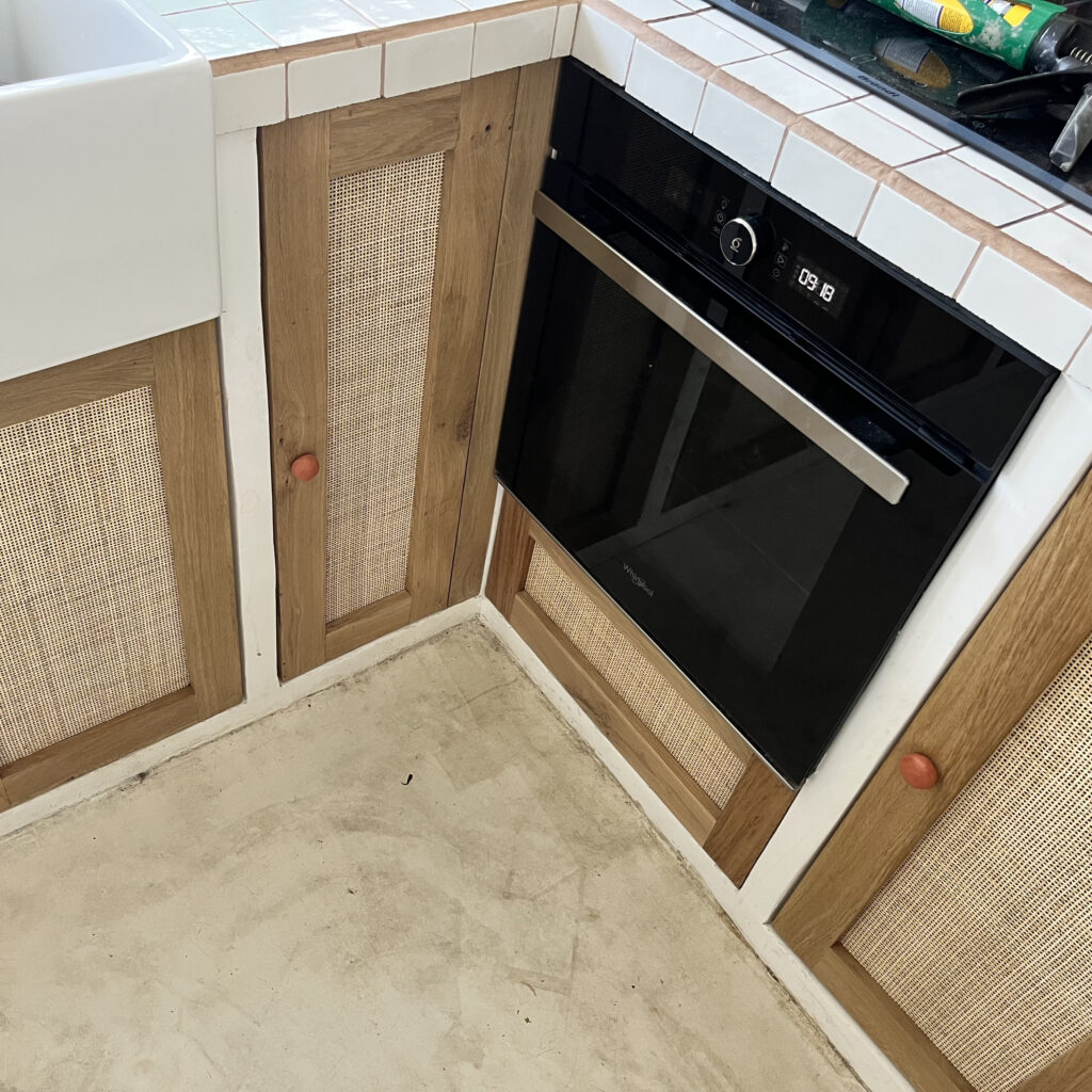 Réalisation d’un chantier atypique à Longeville-sur-Mer, avec la création sur mesure de portes de cuisine en chêne et cannage.