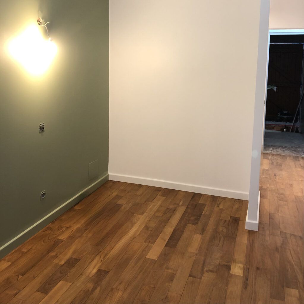Le parquet a été posé en pose collée sur dalle béton, garantissant une stabilité parfaite et une longévité optimale. Chaque lame a été soigneusement ajustée pour offrir une finition soignée et un rendu harmonieux.