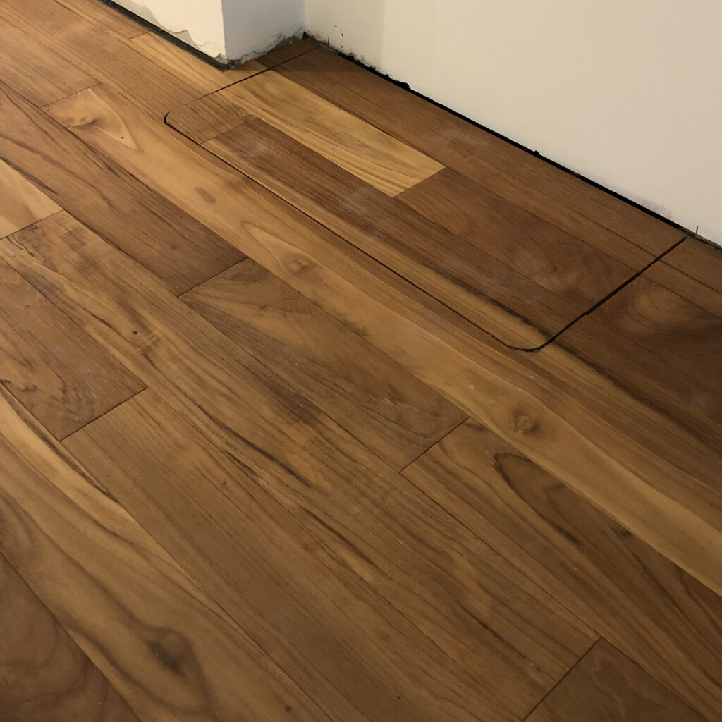 Réalisation d’un chantier de menuiserie à La Tranche-sur-Mer, portant sur la pose d’un parquet en teck massif.
