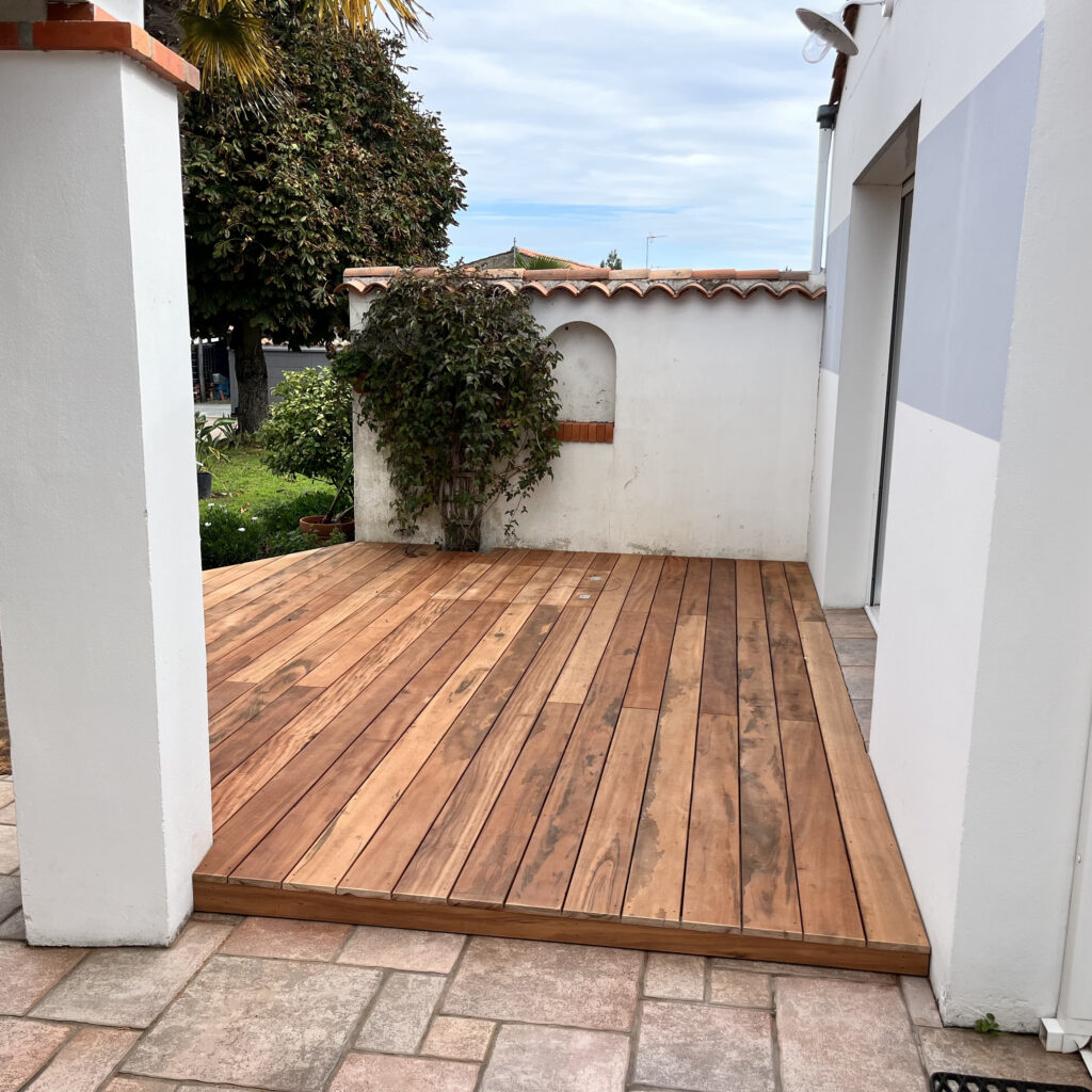 Réalisation d’une terrasse en bois exotique Muiracatiara à Longeville-sur-Mer, un projet alliant esthétique et technicité.