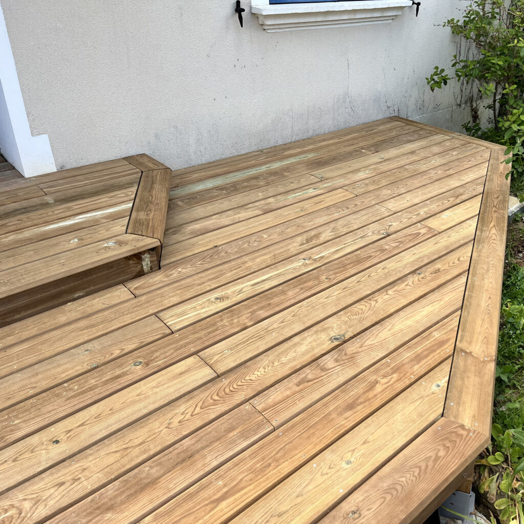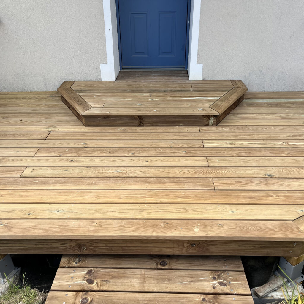 Réalisation d’une terrasse en pin traité classe 4 à Jard-sur-Mer, installée devant l’entrée principale de la maison.